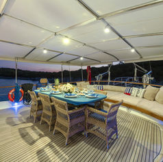 Marine Air-conditioning and Heating System at every cabin with individual control, Sun Mattresses, Sun Awnings, Deck Chairs, Sea Ladder, Deep Freezer, Refrigerator, Ice Cube Maker, Water Maker, Onan Power Generators, Hot Water System, Navigation Equipment, GPS and Radar, Holding and Septic Tanks, Roller Furling Head Sail.