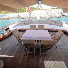 Very comfortable gulet with 3 extremely spacious cabins each with a shower and toilet (shower cubicles at every bathroom). The toilets are electrical flush toilets. Fully air-conditioned. 1 master cabin with a double bed. 2 of the cabins with separate lower double and single beds (twin). Large salon with dining facilities. Fully equipped separate galley. Very spacious sun deck with sun mattresses. Cushioned aft deck with outdoor dining facilities. Separate crew quarters with their own shower/wc.