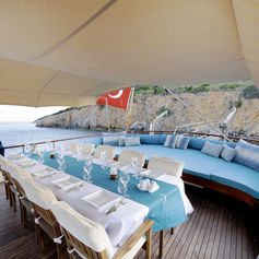 Fully air-conditioned. For up to 12 guests. 6 spacious cabins each with private shower and WC (shower cubicles at every bathroom). The toilets are house type flush toilets. 3 cabins are with two separate single beds (twin). 3 cabins are with double beds. Spacious salon with bar and dinette. Fully equipped separate galley. Very spacious sundeck with sun mattresses. Aft deck with cushions and dining facilities. Separate crew quarters.