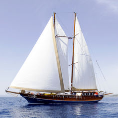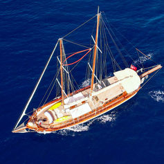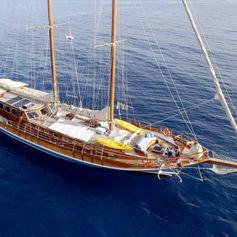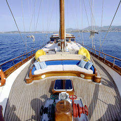 For up to 10 guests in 6 comfortable cabins each with a shower and toilet. Fully air-conditioned. The toilets are house type flush toilets. 2 of the cabins are with a single bed. 4 of the cabins are with one double bed + one upper bunk. Very spacious and comfortable salon with dining facilities. Fully equipped galley. Very spacious aft deck with dining facilities and cushions. Spacious sun deck area with cushions. Separate captain and crew quarters.