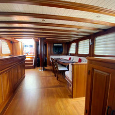 For up to 10 guests in very spacious 5 cabins each with private facilities. Fully air-conditioned. 1 state room at stern with 1 double bed and two bathrooms en suite (one with a wc and a sink, one with a shower cubicle and a sink). 2 master cabins in front with double bed and a bathroom en suite. 2 spacious twin cabins with bathroom en suite. Shower cubicles at every bathroom. The toilets are electrical flush toilets. Large salon with fully equipped bar and dining facilities. Fully equipped separate galley. Spacious cushioned sun deck. Cushioned aft deck with outdoor dining facilities. Separate crew quarters with their own bathroom.
