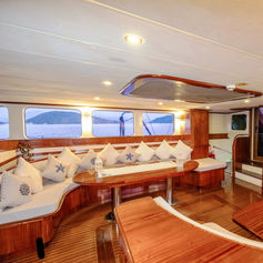 Enormous beautiful gulet for up to 12 guests in very spacious 5 cabins each with private facilities. These 5 cabins include 1 master, 2 double and 2 triple cabins. Fully air-conditioned. Shower cubicles at every bathroom. The toilets are normal home toilets. Very large salon with sofa and dining facilities. Fully equipped separate galley. Spacious cushioned sun deck. Cushioned aft deck with outdoor dining facilities. Separate crew quarters with their own bathroom.