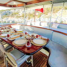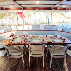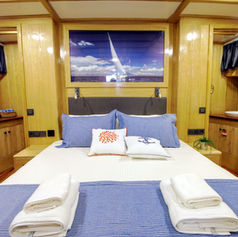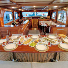 Very comfortable gulet with 4 spacious cabins each with a shower (shower cubicles) and toilet. 2 of the cabins are master cabins with a double bed. 1 spacious cabin with a double bed. 1 spacious cabin with two single beds (twin). The toilets in the front 3 cabins are regular household toilets, the toilet in the master cabin at the rear is an electric pump toilet. Large salon with dining facilities. Fully equipped separate galley. Very spacious sun deck with sun mattresses. Cushioned aft deck with outdoor dining facilities. Fully air-conditioned. Separate crew quarters with their shower/WC.